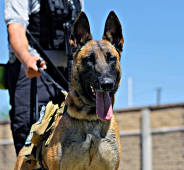 Ofrecemos servicios de seguridad con binomios caninos, integrando elementos entrenados junto a perros seleccionados para funciones específicas de vigilancia, control y disuasión.
